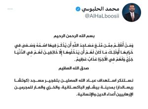 وقال الحلبوسي في تغريدة عبر تويتر طالعتها الرشيد: “نستنكر استهداف عباد الله المصلين بتفجير مسجد(كوتشا ريسالدار) بمدينة بيشاور الباكستانية”.