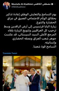 واضاف، ان “زيارة البابا فرنسيس إلى أرض الرافدين وسط ترحيب كل العراقيين وتتويج الزيارة بلقاء المرجع الأعلى السيد السيستاني، قد عكست جوهر شعب العراق وعمقه الحضاري وإنسانيته، التسامح قوة شعبنا”.