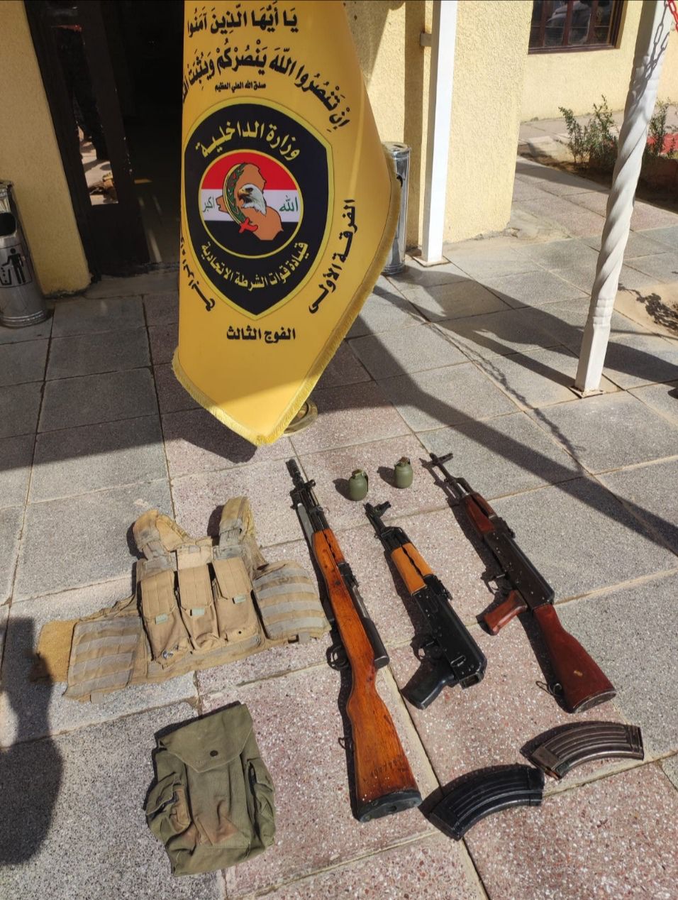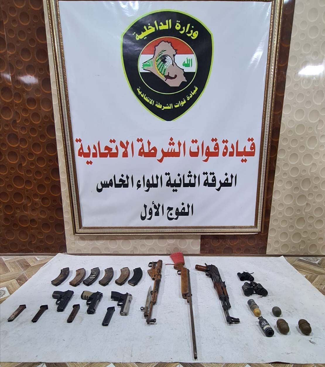 واضافت، كما “نفّذت قوة من اللواء الرابع الفرقة الأولى شرطة اتحادية بالاشتراك مع مفارز استخبارات الفوج الثالث ومفرزة من جهاز الأمن الوطني، عملية تفتيش على السلاح غير المرخص في منطقة (السلام الثانية) جنوب شرقي بغداد، تم خلالها العثور على 3 بنادق مختلفة الأنواع ، 2 رمانة هجومية ، مخزني بندقية، وتم ضبط جميع المواد والتعامل معها اصولياً”.