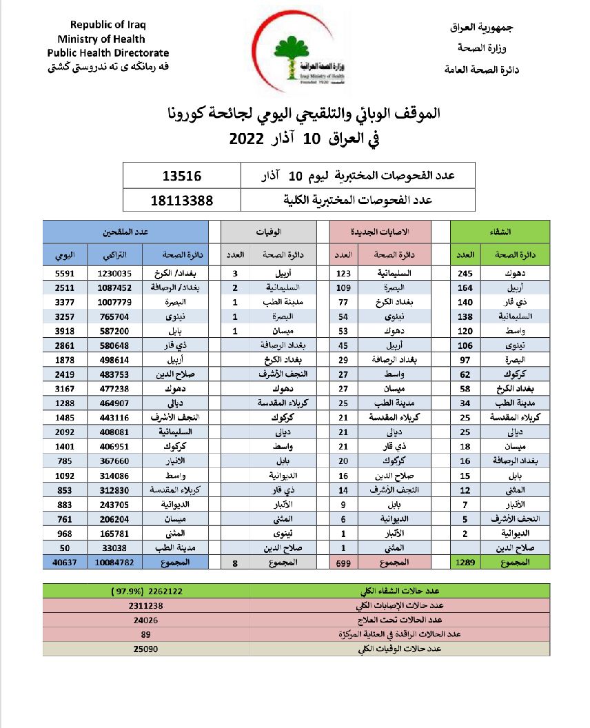 وقالت الوزارة، في بيان تلقته الرشيد، أنه “تم تسجيل 699 إصابة جديدة بفيروس كورونا، و 1289 حالة شفاء من المرض”.