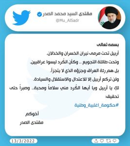 قراءة: السيد الصدر: اربيل تحت مرمى نيران الخسران والخذلان