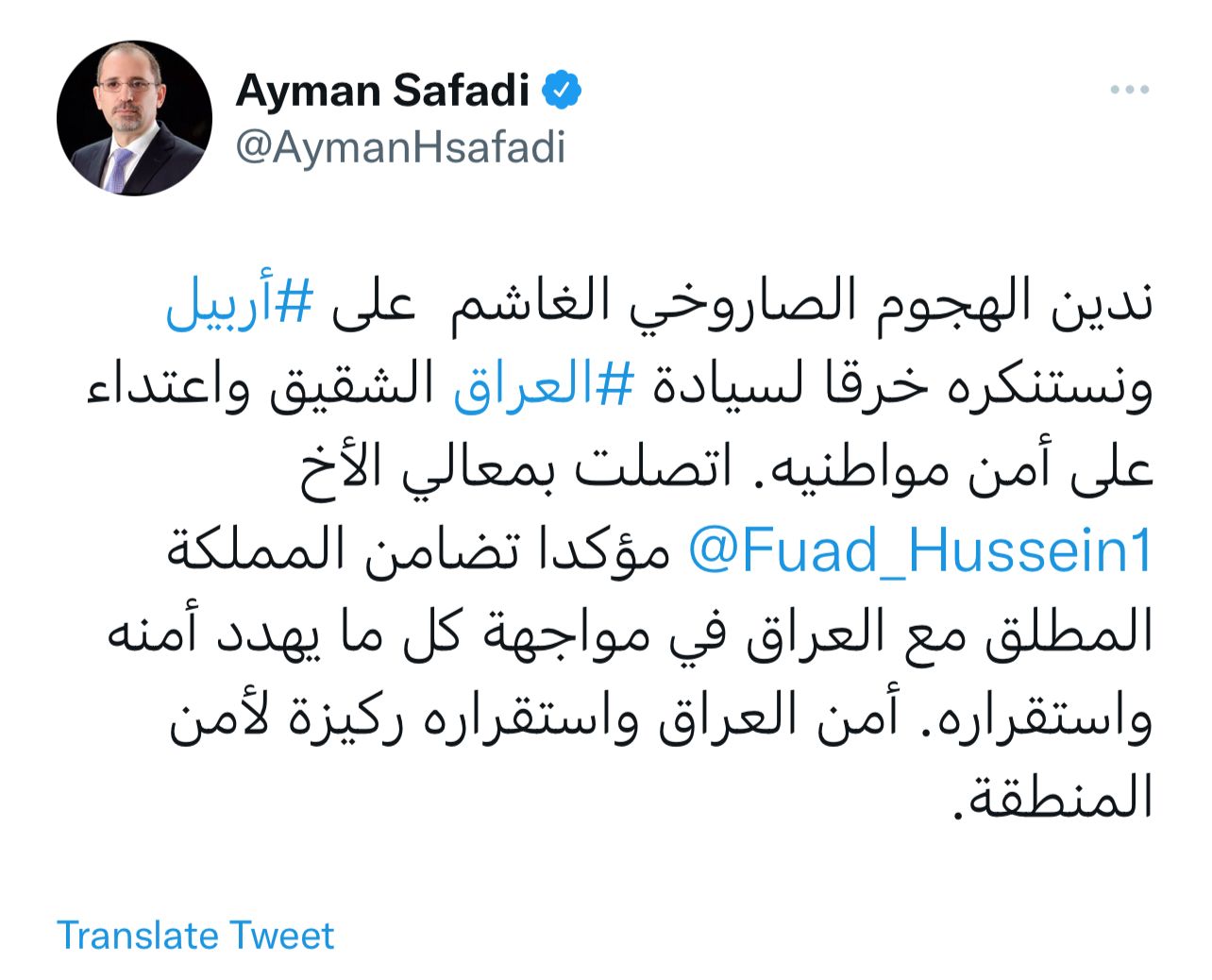 وقال وزير الخارجية وشؤون المغتربين – المملكة الأردنية الهاشمية ايمن الصفدي، في تغريدة له عبر تويتر طالعتها الرشيد، “ندين الهجوم الصاروخي الغاشم على أربيل ونستنكره خرقا لسيادة العراق الشقيق واعتداء على أمن مواطنيه”.