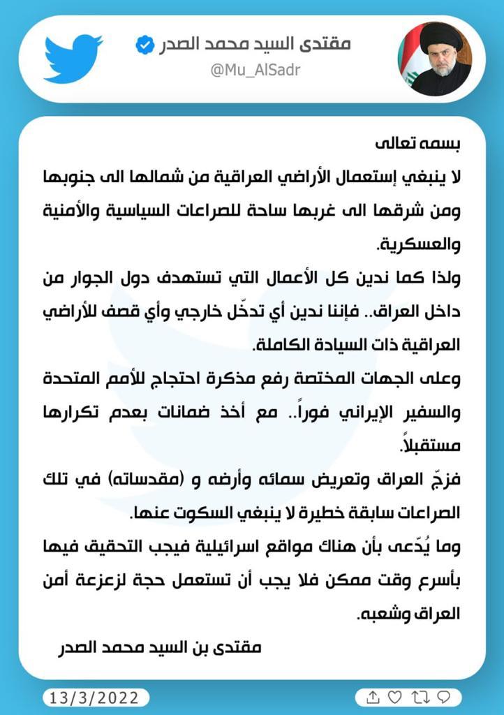 وقال الصدر في تغريدة له على حسابه في “تويتر”، وطالعتها الرشيد: إنَّ “الأراضي العراقية من شمالها الى جنوبها ومن شرقها الى غربها لا ينبغي استعمالها ساحة للصراعات السياسية والأمنية والعسكرية”، مديناً “جميع الأعمال التي تستهدف دول الجوار من داخل العراق، وأي تدخل خارجي وأي قصف للأراضي العراقية ذات السيادة الكاملة”.