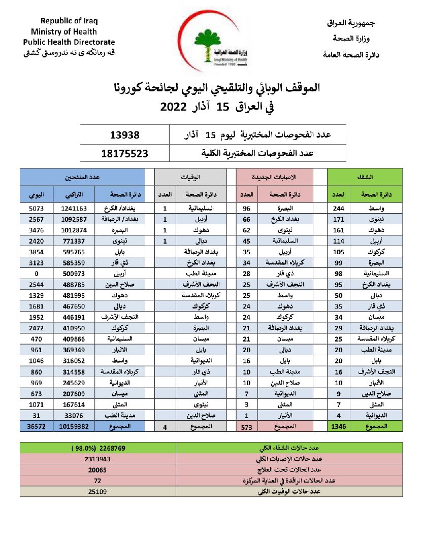 أعلنت وزارة الصحة، اليوم الثلاثاء، الموقف الوبائي اليومي لجائحة كورونا في عموم العراق.