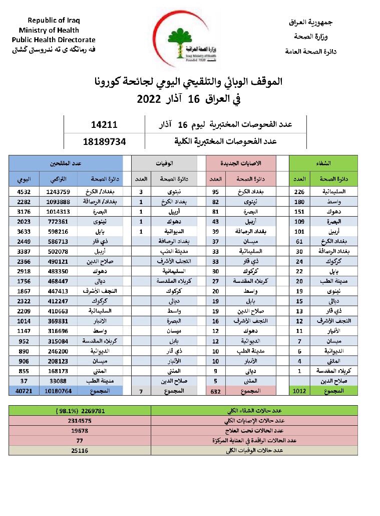 أعلنت وزارة الصحة، اليوم الاربعاء، الموقف الوبائي اليومي لجائحة كورونا في عموم العراق.