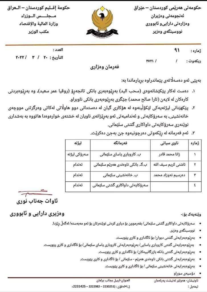 اصدرت وزارة المالية في اقليم كردستان، اليوم الاحد، قراراً بسحب يد مديرة مصرف على خلفية وفاة متقاعدين اثنين.