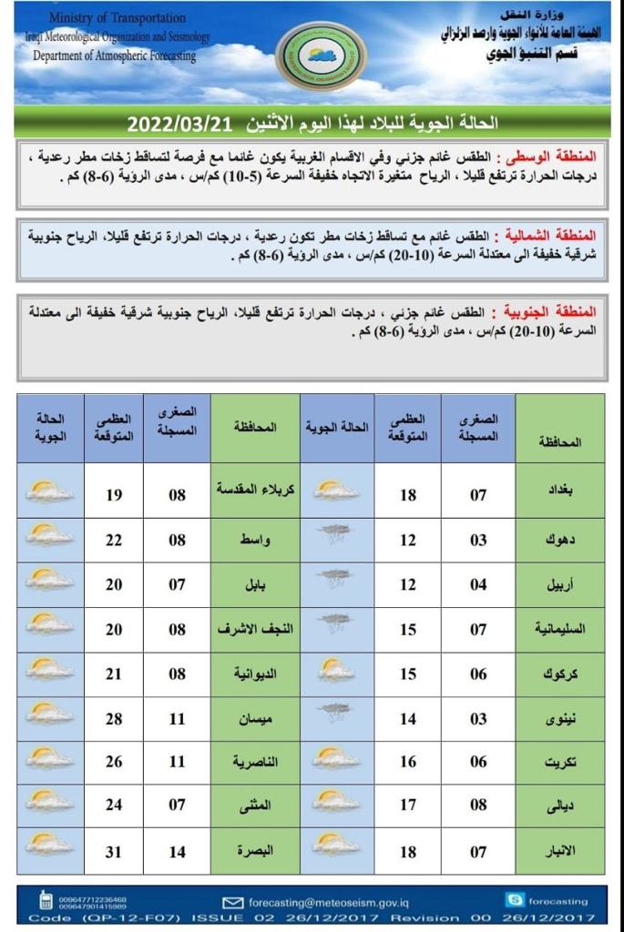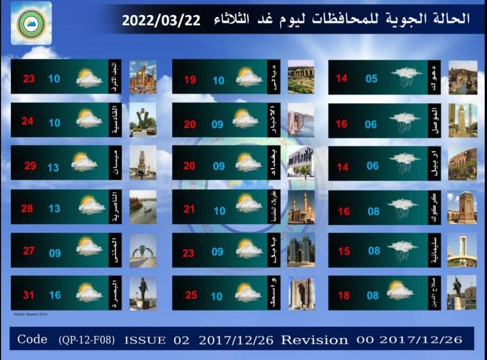 محلياتطقس العراق.. انخفاض بدرجات الحرارة وامطار خفيفة خلال الايام المقبلة قبل 4 سنوات 7 مشاهدات شارك الطقساعلنت هيئة الانواء الجوية، حالة الطقس في العراق خلال الايام المقبلة، فيما اشارت الى انخفاض بدرجات الحرارة وامطار خفيفة. الوسومطقس العراققد يهمك أيضا سياسة المجلس السياسي الوطني يعلن الاتفاق على آليات تسهل حسم اختيار رئيس مجلس النواب قبل 56 دقيقة 3 مشاهدات الحكم الرابع الـVAR يتلاعب بدورينا .. تفاصيل صادمة في الحكم الرابع قبل ساعة واحدة 5 مشاهدات عربي ودولي الحكومة الليبية تعلن مقتل رئيس الأركان محمد الحداد ومرافقيه اثر تحطم طائرتهم في أنقرة قبل ساعتين 16 مشاهدات عربي ودولي مقتل رئيس الأركان الليبي "محمد الحداد" ومرافقيه بتحطم طائرتهم أثناء عودتهم من أنقرة قبل ساعتين 15 مشاهدات عربي ودولي وسائل إعلام تركية: العثور على حطام طائرة رئيس الاركان الليبي التي سقطت بعد إقلاعها من أنقرة قبل ساعتين 8 مشاهدات