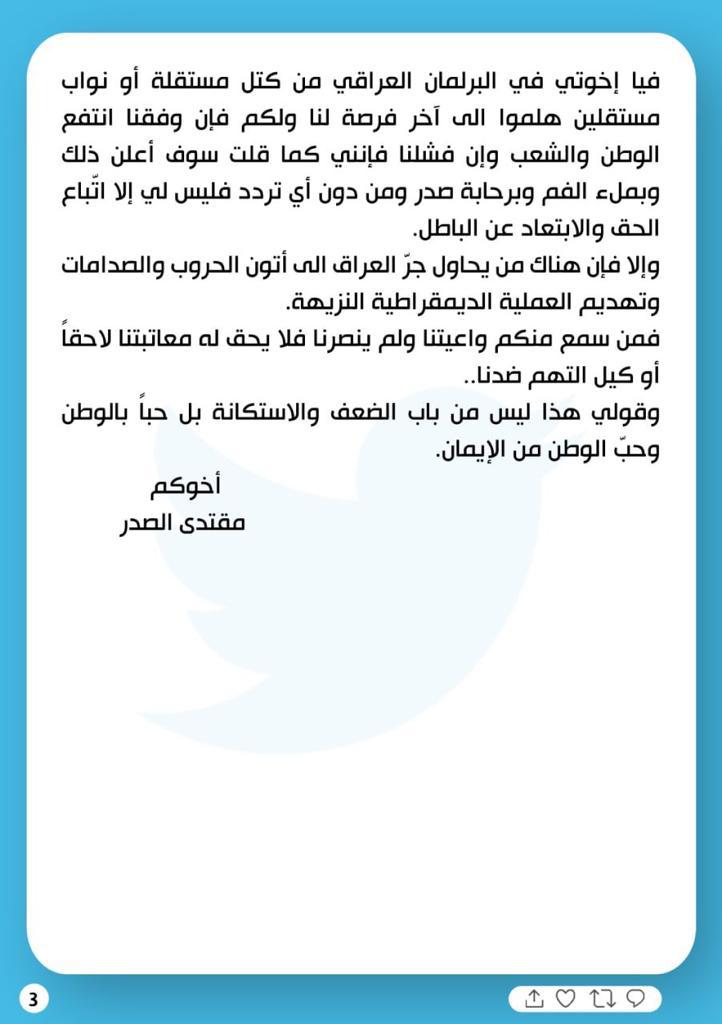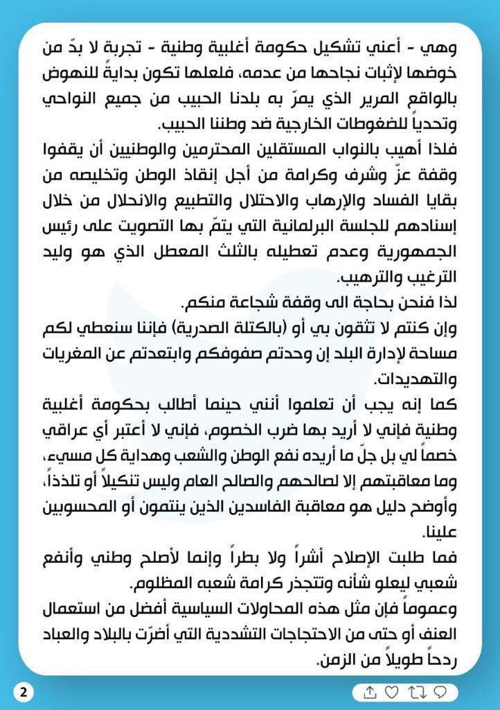 قراءة: السيد الصدر يدعو النواب المستقلين لاسناد جلسة التصويت على رئيس الجمهورية