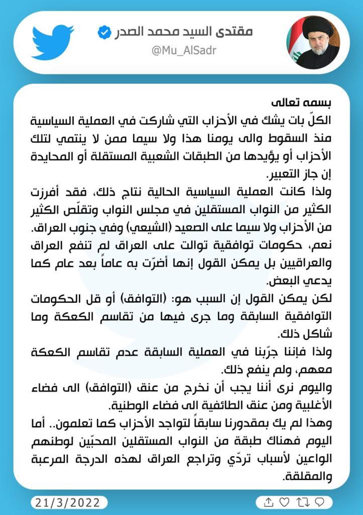 أكد زعيم التيار الصدري مقتدى الصدر، اليوم الاثنين، على ضرورة الخروج من عنق التوافق إلى فضاء الأغلبية، فيما دعا النواب المستقلين لإسناد جلسة التصويت على رئيس الجمهورية.