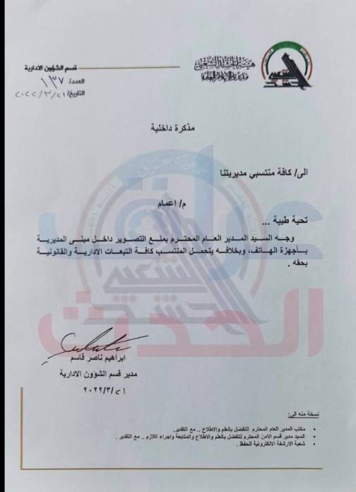 أمنمنها منع التصوير بالهاتف النقال .. توجيهات صارمة لمنتسبي الحشد الشعبي (وثيقة) قبل 4 سنوات 5 مشاهدات شارك الحشد الشعبي الوسومالحشد الشعبيقد يهمك أيضا عربي ودولي مقتل أستاذ طاقة نووية أمريكي قرب بوسطن بطلق ناري قبل 14 دقيقة 4 مشاهدات محليات الانواء الجوية: أمطار وضباب وارتفاع في درجات الحرارة خلال الايام المقبلة قبل 34 دقيقة 4 مشاهدات أمن شرطة الديوانية تنوه الى تفجير مسيطر عليه في المحافظة قبل 49 دقيقة 5 مشاهدات سياسة السيد الصدر يقرر تجميد سرايا السلام في البصرة والكوت لمدة ستة اشهر قبل 11 ساعة 14 مشاهدات رياضة الفرنسي عثمان ديمبلي يفوز بجائزة "ذا بيست" لأفضل لاعب في العالم قبل 13 ساعة 8 مشاهدات