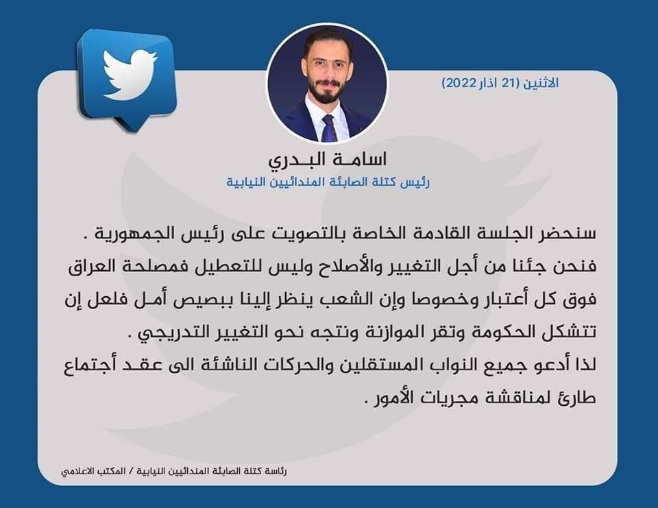 سياسةكتلة الصابئة المندائيين النيابية تعلن حضور جلسة انتخاب رئيس الجمهورية قبل 4 سنوات 7 مشاهدات شارك الوسومرئيس الجمهوريةكتلة الصابئة المندائيينمجلس النواب العراقيقد يهمك أيضا أمن شرطة النجف تنفي قيامها بمداهمات في الصحراء: لا تهديدات تؤثر على أمن السكان أو المناطق الدينية قبل 12 دقيقة 3 مشاهدات رياضة بعد إنقاذ سانتوس من الهبوط.. جراحة طارئة تهدد مستقبل نيمار قبل 27 دقيقة 3 مشاهدات أقتصاد ارتفاع الذهب مستفيدا من ضعف الدولار قبل 41 دقيقة 7 مشاهدات محليات وزارة التربية في إقليم كردستان تعطل دوام المدارس 10 أيام بمناسبة رأس السنة الميلادية الجديدة قبل 60 دقيقة 7 مشاهدات أقتصاد استقرار أسعار الصرف في الأسواق المحلية: 143750 ديناراً مقابل كل 100 دولار قبل ساعتين 13 مشاهدات