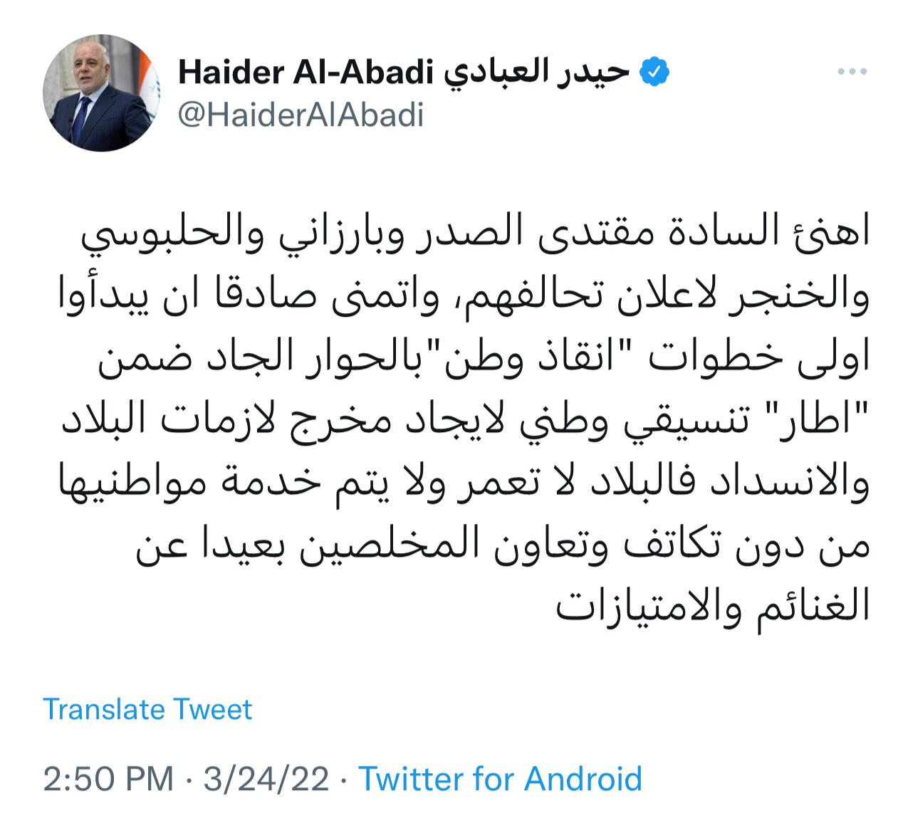 سياسةالعبادي يهنئ السيد الصدر والحلبوسي وبارزاني باعلان تحالف انقاذ الوطن قبل 4 سنوات 8 مشاهدات شارك الوسومحيدر العباديقد يهمك أيضا محليات بالوثيقة.. صدور مذكرة قبض بحق "حسين العنكوشي" بتهمة إهانة رمز ديني بطريقة علنية قبل 5 دقائق 4 مشاهدات أقتصاد العمل تعلن إطلاق راتب المعين المتفرغ لشهر كانون الأول قبل 33 دقيقة 7 مشاهدات عربي ودولي حماس: الاحتلال يعرقل الانتقال للمرحلة الثانية من اتفاق وقف إطلاق النار في غزة قبل 35 دقيقة 4 مشاهدات عربي ودولي وزير الخارجية السوري: العلاقات مع روسيا تدخل مرحلة جديدة قبل ساعة واحدة 5 مشاهدات أمن اعتقال 20 متهماً بالحرق العشوائي في النهروان جنوب شرق بغداد قبل ساعة واحدة 4 مشاهدات