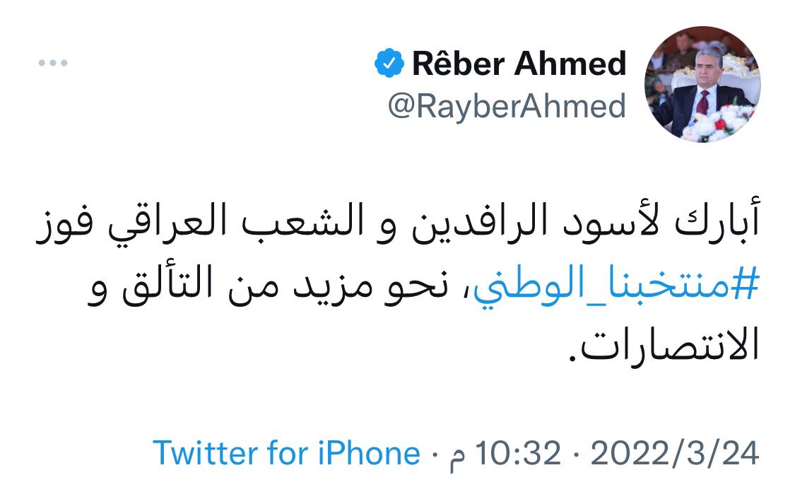 وقال أحمد، في تغريدة على تويتر تابعتها الرشيد، “ابارك لاسود الرافدين والشعب العراقي فوز منتخبنا الوطني، نحو مزيد من التألق والانتصارات”.