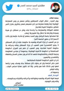 قراءة: السيد الصدر: يوم السبت ننتظر من النواب المستقلين والمعارضة الوطنية وقفة مشرفة