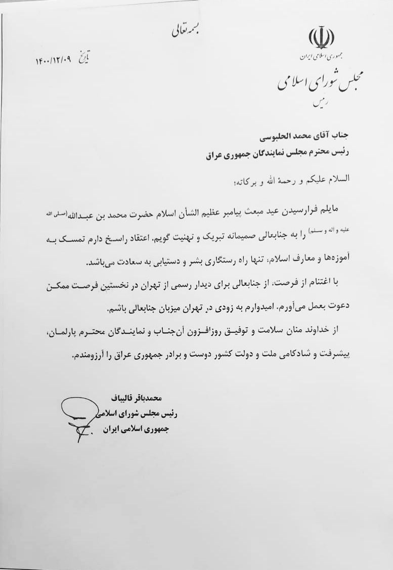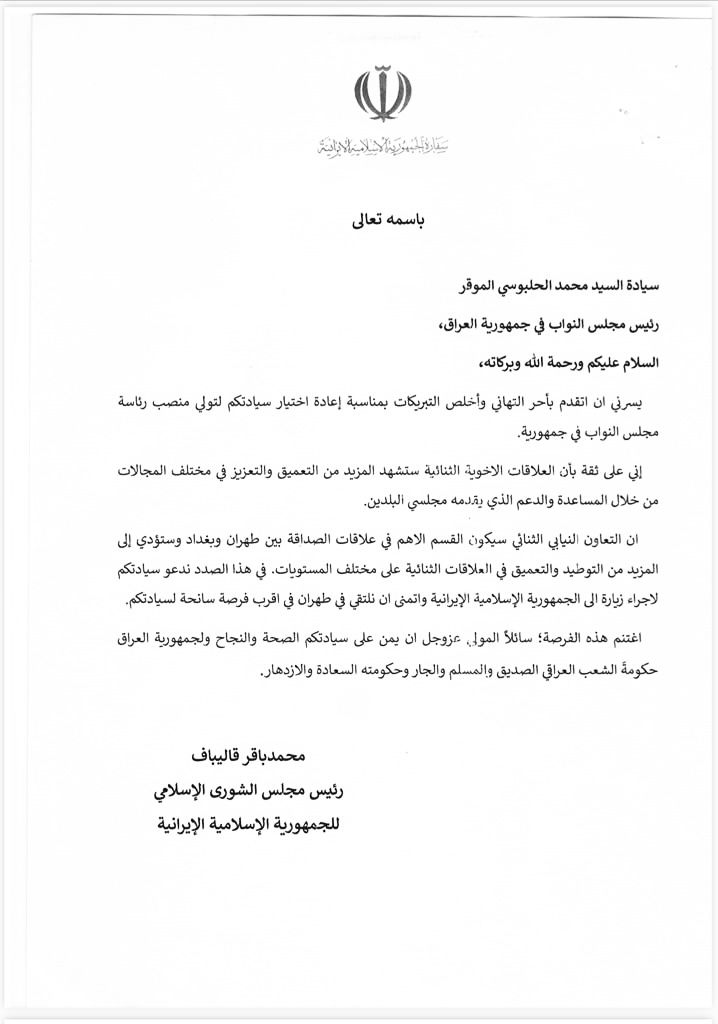 من المقرر أن يجري رئيس مجلس النواب محمد الحلبوسي، يوم الأحد يرافقه وفد نيابي، زيارةً إلى طهران عاصمة الجمهورية الإسلامية الإيرانية؛ تلبيةً لدعوة رسمية من رئيس مجلس الشورى الإسلامي الإيراني محمد باقر قاليباف.
