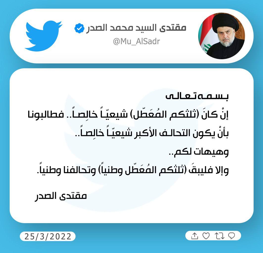 سياسةالسيد الصدر يغرد بشأن جلسة السبت قبل 4 سنوات 2 مشاهدات شارك الوسومالصدرقد يهمك أيضا أمن بسبب المطالبة بإبراز الهويات.. اندلاع اشتباكات بين قوتين أمنيتين بنقطة تفتيش قرب جمجمال في السليمانية قبل 6 دقائق 2 مشاهدات محليات الداخلية تعلن نتائج التحقيق بحادثة طلب مبالغ مالية من مواطن تركي في مطار بغداد قبل 25 دقيقة 5 مشاهدات عربي ودولي الطاقة الذرية: تضرر الدرع الواقي لمحطة تشرنوبل النووية بسبب هجوم بطائرة مسيرة قبل 30 دقيقة 5 مشاهدات عربي ودولي مع استمرار المفاوضات.. جيش أوكرانيا يؤكد: لا تنازل عن الأرض لروسيا قبل 56 دقيقة 6 مشاهدات عربي ودولي بالرصاص الحي والغاز السام.. إسرائيل تقتحم بلدات الضفة الغربية قبل ساعة واحدة 7 مشاهدات