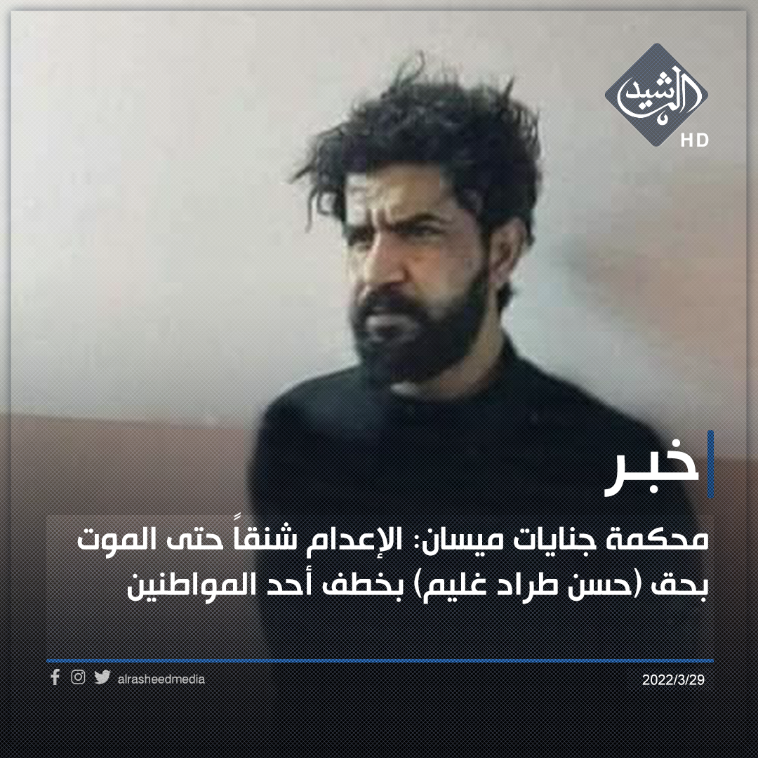 محكمة جنايات ميسان: الإعدام شنقاً حتى الموت بحق (حسن طراد غليم) بخطف أحد المواطنين