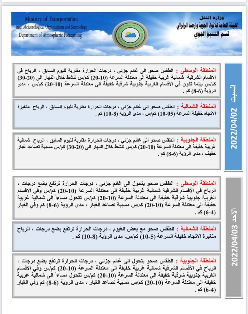 أعلنت هيئة الأنواء الجوية، اليوم الجمعة، عن حالة الطقس في البلاد للأيام المقبلة، فيما توقعت انخفاض درجات الحرارة اعتبارا من الاثنين.