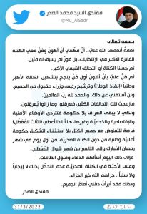 يذكر ان زعيم التيار الصدري السيد مقتدى الصدر، قد منح الاطار التنسيقي الفرصة للتفاوض مع جميع الكتل السياسية بلا استثناء من اجل تشكيل حكومة اغلبية وطنية من دون الكتلة الصدرية، وحدد ذلك اعتباراً من اول يوم في شهر رمضان الى التاسع من شوال المقبل، فيما دعا كتلته الى عدم التدخل لا ايجاباً ولا سلباً.
