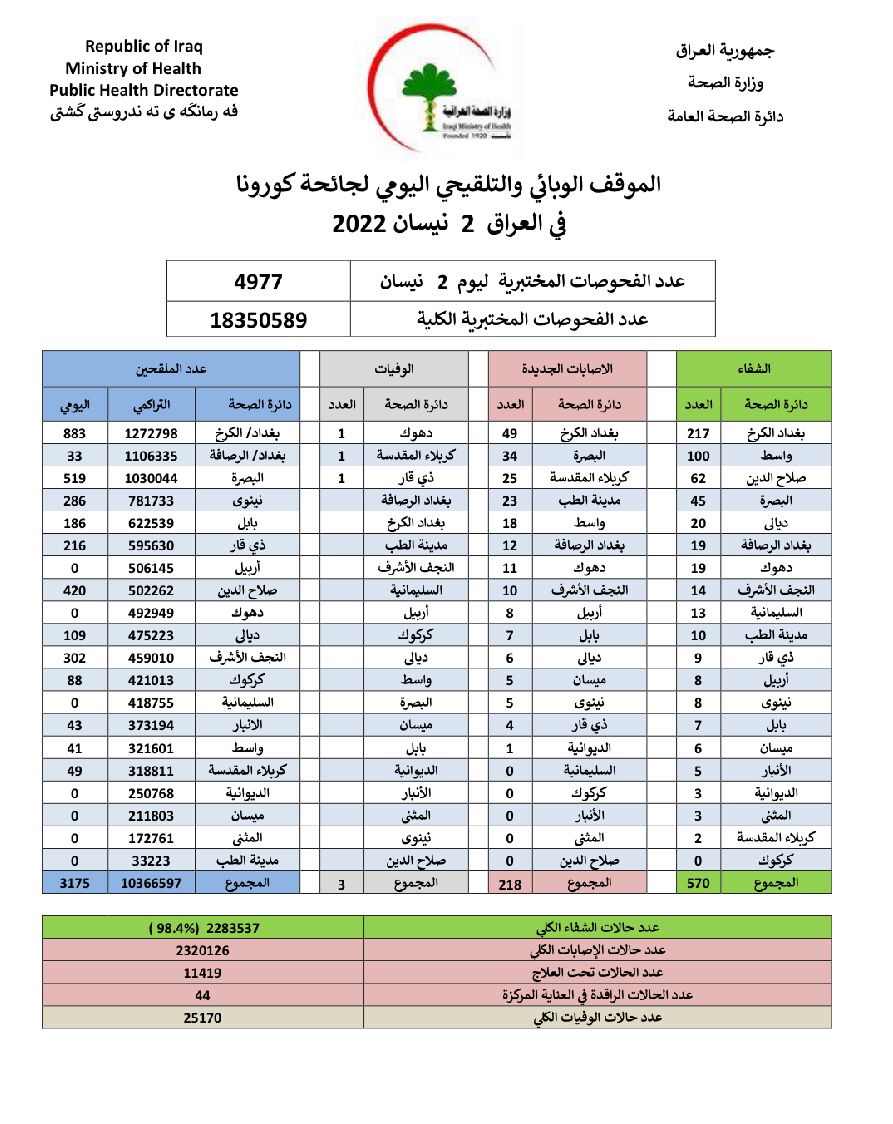 أعلنت وزارة الصحة، اليوم السبت، الموقف الوبائي اليومي لجائحة كورونا في عموم العراق.