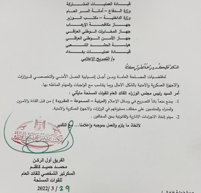 أمنبالوثيقة .. الكاظمي يأمر بمنع التصريح في وسائل الاعلام من قبل قادة ومنتسبي الأجهزة الامنية قبل 4 سنوات 5 مشاهدات شارك الكاظمي الوسومالكاظميقد يهمك أيضا رياضة أرنولد: مواجهة الجزائر تحدٍ كبير وهدفنا الوصول إلى نهائي البطولة قبل 16 دقيقة 5 مشاهدات سياسة النزاهة تعلن استردادها أكثر من (١٧) مليون دولار من عائدات الفساد قبل 25 دقيقة 4 مشاهدات رياضة مدرب الجزائر: منتخب العراق يلعب بشجاعة وهدفنا التأهل إلى الدور المقبل قبل 37 دقيقة 7 مشاهدات عربي ودولي الأمم المتحدة تواجه "أقسى أزمة تمويل" وتقلّص مساعداتها قبل 50 دقيقة 6 مشاهدات أقتصاد تجاوزت 233 مليار دينار.. المالية تعلن تمويل الدفعة السابعة من مستحقات الفلاحين قبل ساعة واحدة 5 مشاهدات
