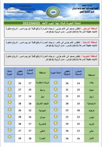 اعلنت هيئة الانواء الجوية، الاحد، حالة الطقس في العراق خلال الايام المقبلة، فيما اشارت الى انخفاض درجات الحرارة اعتبارا من الغد.