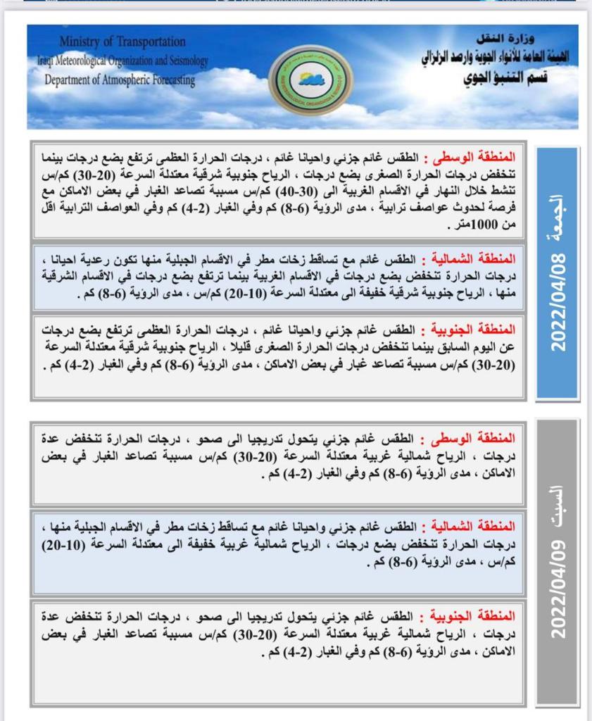 الانواء الجوية: امطار خفيفة ومتوسطة مع تصاعد للغبار خلال الايام المقبلة