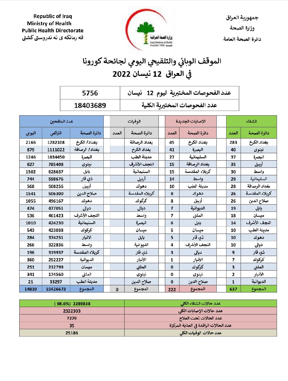أعلنت وزارة الصحة، اليوم الاثنين، الموقف الوبائي اليومي لجائحة كورونا في عموم العراق.