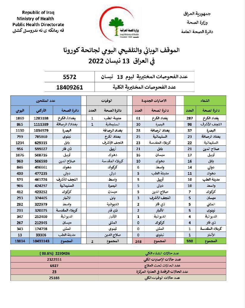 أعلنت وزارة الصحة، اليوم الاربعاء، الموقف الوبائي اليومي لجائحة كورونا في عموم العراق.