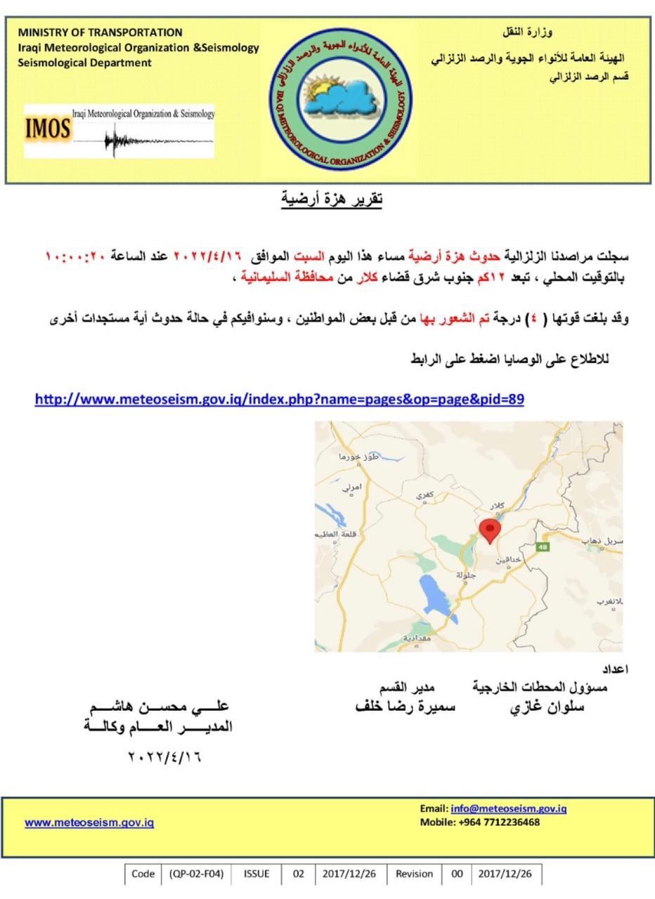 وبين تقرير الهزة، انها “سجلت في تمام الساعة 10:00:20 مساء اليوم بالتوقيت المحلي وقد بلغت قوتها ( 4 ) درجة حيث تبعد ( 12 ) كم جنوب شرق قضاء كلار من محافظة السليمانية، وقد تم الشعور بها من قبل المواطنين في المنطقة”.