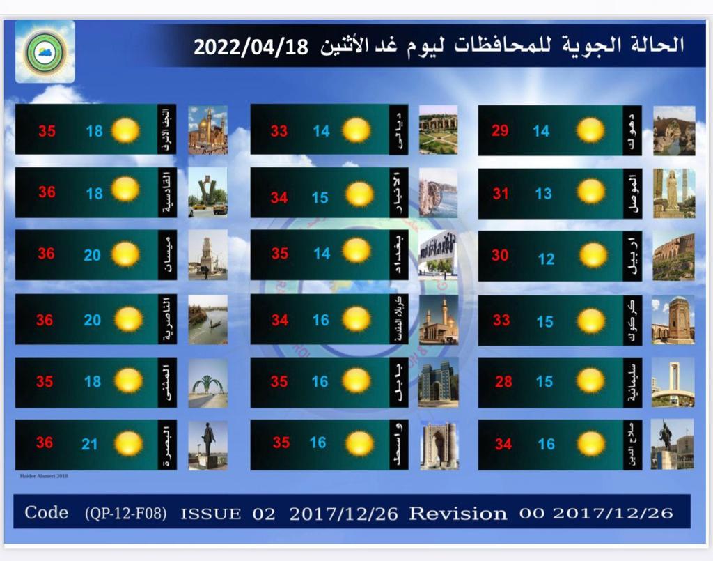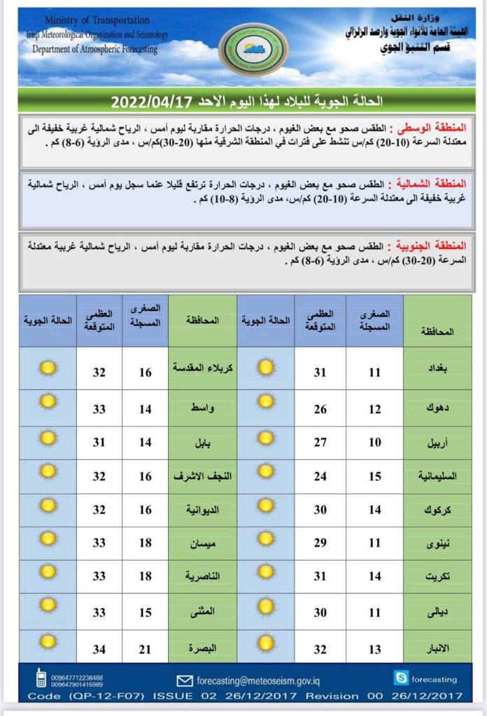 أعلنت هيئة الأنواء الجوية، اليوم الأحد، عن حالة الطقس في البلاد للأيام المقبلة، فيما توقعت ارتفاعاً بدرجات الحرارة وتصاعداً للغبار الأسبوع الحالي.