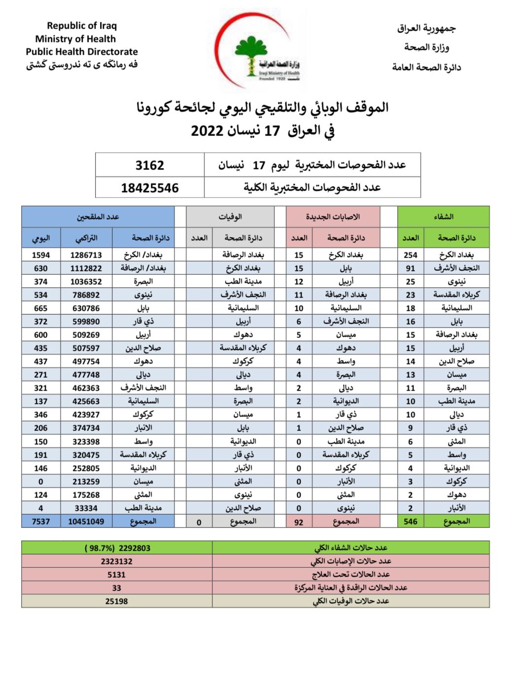 أعلنت وزارة الصحة، اليوم الاحد، الموقف الوبائي اليومي لجائحة كورونا في عموم العراق.