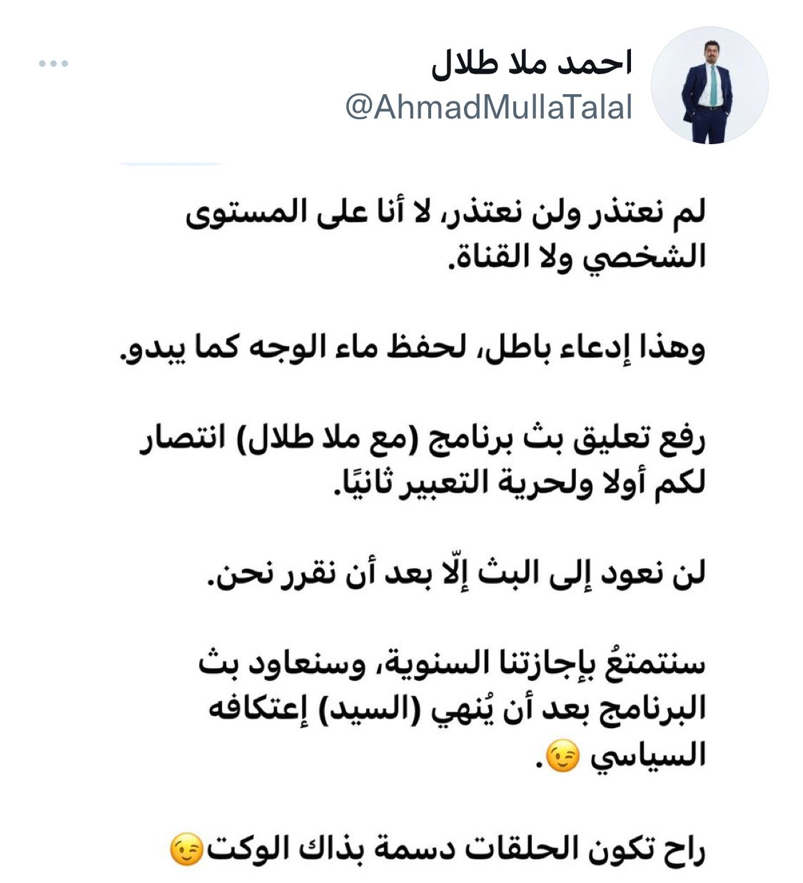 سياسةملا طلال مغرداً بعد رفع تعليق بث برنامجه: لم ولن نعتذر وهو ادعاء باطل لحفظ ماء الوجه قبل 4 سنوات 12 مشاهدات شارك الوسوماحمد ملا طلالقد يهمك أيضا أقتصاد الصناعة: تحقيق الاكتفاء الذاتي من غازي النيتروجين والأوكسجين وفرض رسوم على المستورد قبل 37 دقيقة 7 مشاهدات أقتصاد تعرف على اسعار صرف الدولار عند اغلاق البورصة قبل 39 دقيقة 4 مشاهدات عربي ودولي وزير الدفاع الإسرائيلي: لن ننسحب من غزة بالكامل أبداً وسنعيد استيطان شمال القطاع قبل ساعة واحدة 5 مشاهدات سياسة الكهرباء: خسارة المنظومة الكهربائية ما بين 4000 إلى 4500 ميغاواط قبل ساعة واحدة 4 مشاهدات سياسة وزارة الكهرباء تعلن توقف الغاز الإيراني بالكامل قبل ساعة واحدة 11 مشاهدات