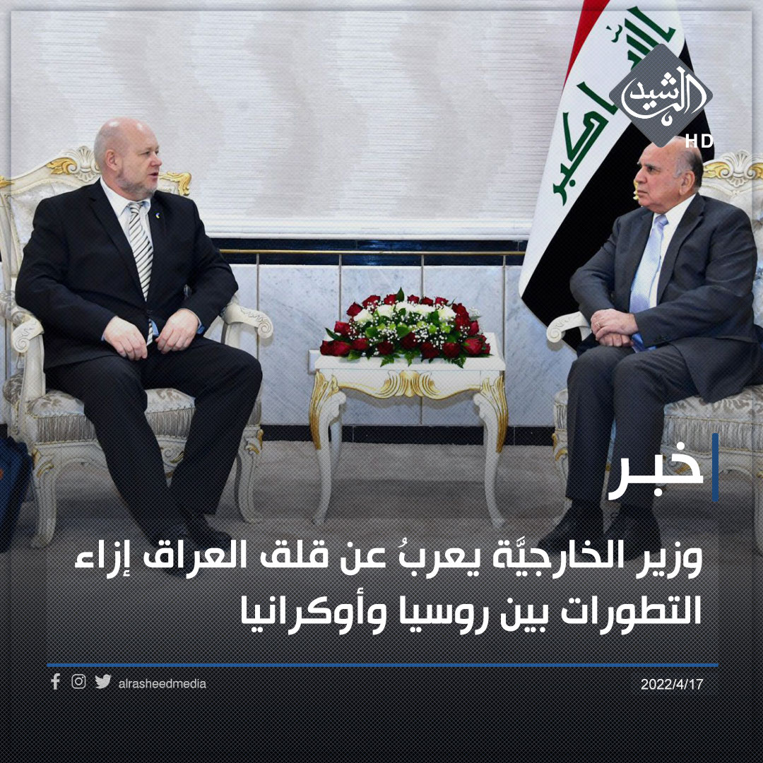 وذكرت الخارجية، في بيان تلقته الرشيد، ان “وزيرها إستقبلَ القائم بأعمال السفارة الأوكرانيَّة في بغداد إليكسندر بورفجينكوف، وجرى خلال اللقاء بحث العلاقات الثنائيَّة بين البلدين، وتأثيرات العمليات العسكريّة الدائرة بين روسيا وأوكرانيا، وتداعياتها على المُستوى الإنسانيّ، وعلى السلم والأمن الدوليين، وكذلك في آثارها الاقتصاديّة الكبيرة على دول العالم ومنها العراق”.