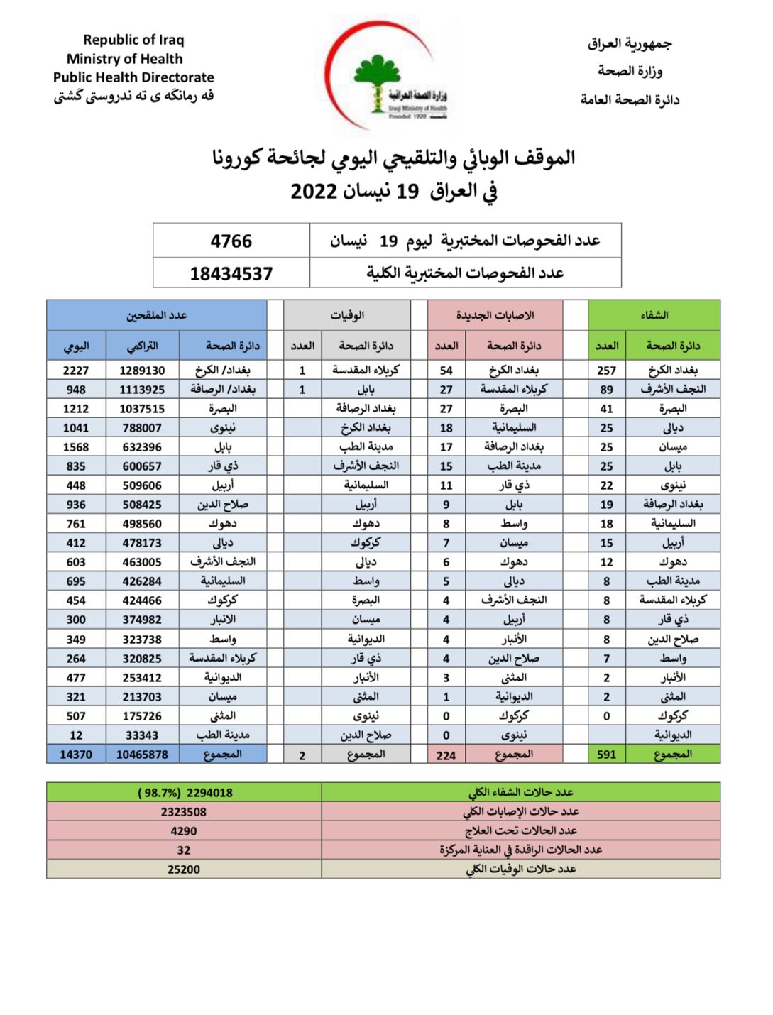 أعلنت وزارة الصحة، اليوم الثلاثاء، الموقف الوبائي اليومي لجائحة كورونا في عموم العراق.