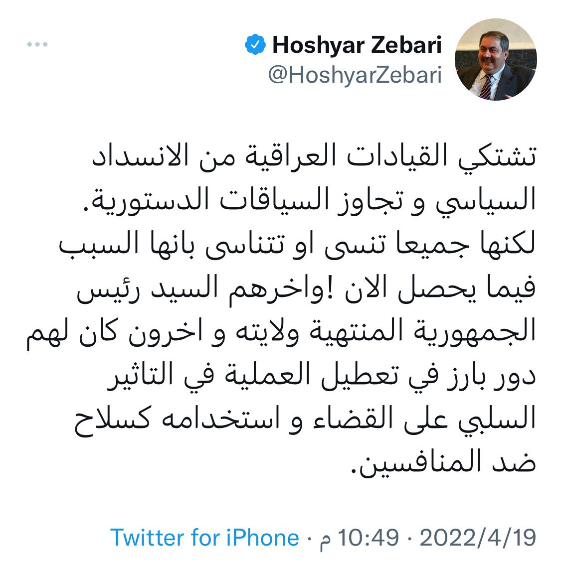 سياسةزيباري: القيادات العراقية تشتكي الانسداد السياسي وتتناسى دورها في تعطيل العملية قبل 4 سنوات 4 مشاهدات شارك الوسومهوشيار زيباريقد يهمك أيضا سياسة المجلس السياسي الوطني يعلن الاتفاق على آليات تسهل حسم اختيار رئيس مجلس النواب قبل 8 ساعات 12 مشاهدات الحكم الرابع الـVAR يتلاعب بدورينا .. تفاصيل صادمة في الحكم الرابع قبل 8 ساعات 11 مشاهدات عربي ودولي الحكومة الليبية تعلن مقتل رئيس الأركان محمد الحداد ومرافقيه اثر تحطم طائرتهم في أنقرة قبل 8 ساعات 20 مشاهدات عربي ودولي مقتل رئيس الأركان الليبي "محمد الحداد" ومرافقيه بتحطم طائرتهم أثناء عودتهم من أنقرة قبل 8 ساعات 20 مشاهدات عربي ودولي وسائل إعلام تركية: العثور على حطام طائرة رئيس الاركان الليبي التي سقطت بعد إقلاعها من أنقرة قبل 8 ساعات 11 مشاهدات