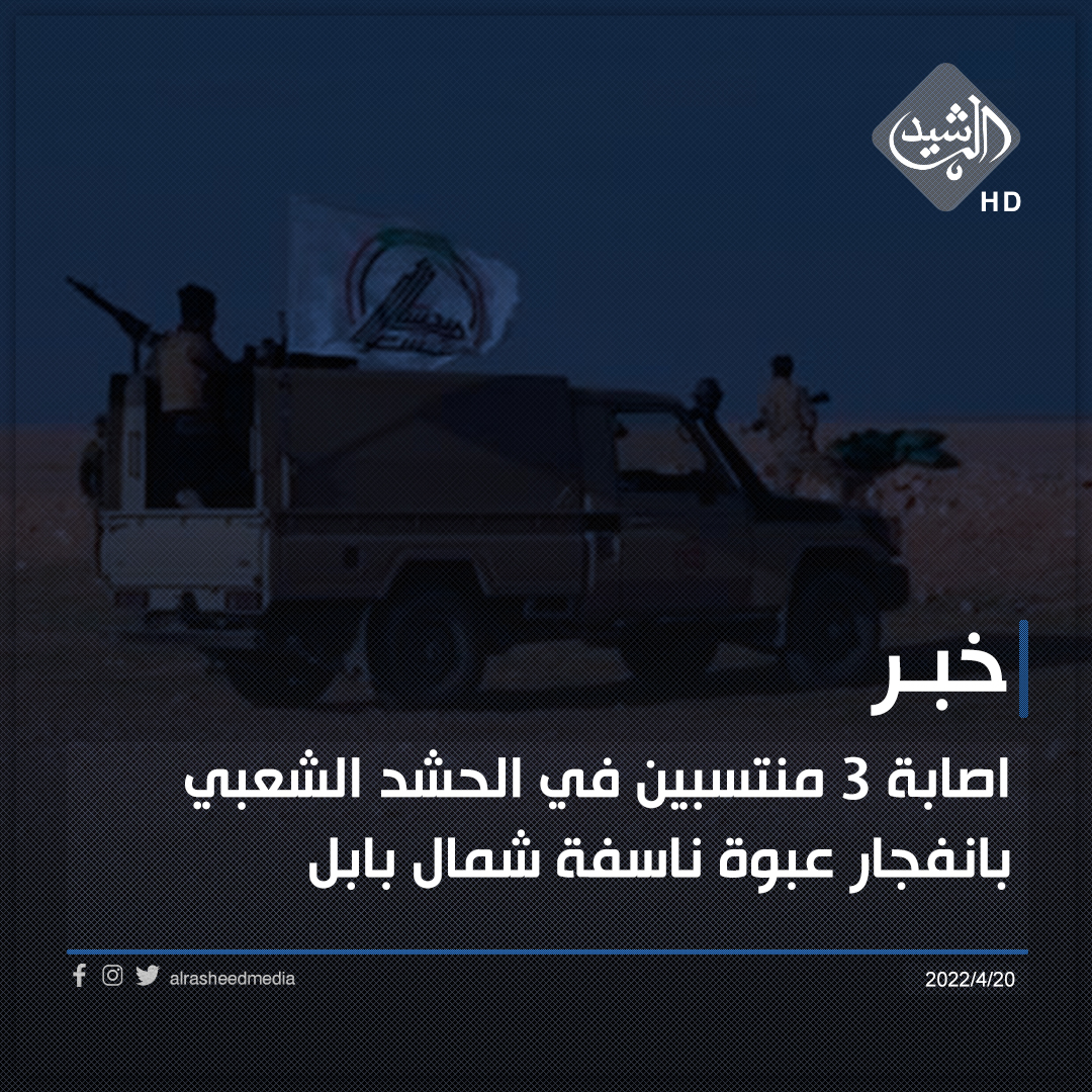 وذكرت الهيئة، في بيان تلقته الرشيد، ان “ثلاثة منتسبين في اللواء 47 / عمليات الجزيرة بالحشد الشعبي، اصيبوا اثر انفجار عبوة ناسفة قبل ان يعقب ذلك اطلاق نار كثيف من جهة الرويعية على آلية تابعة للواء في ناحية جرف النصر شمال بابل”.