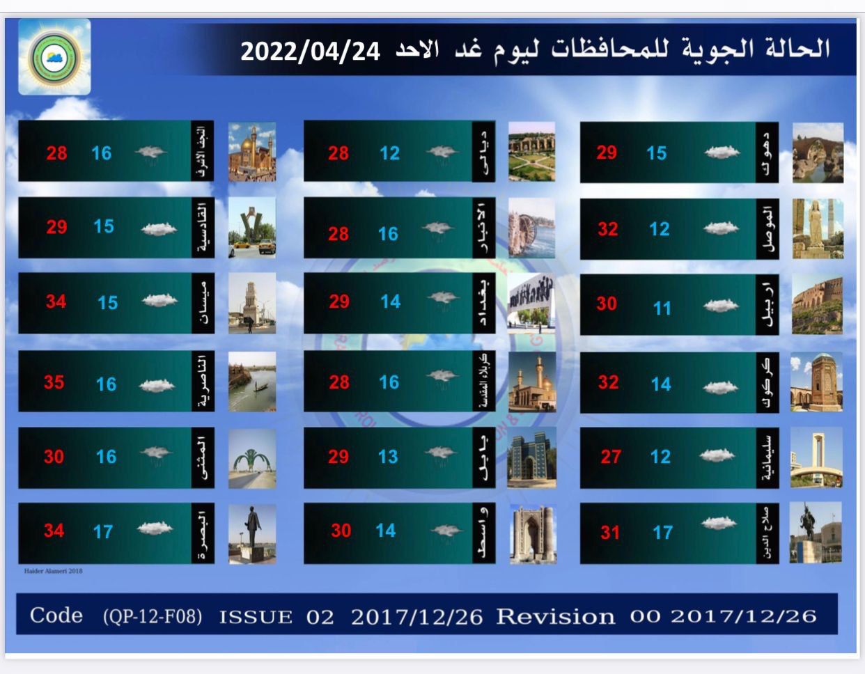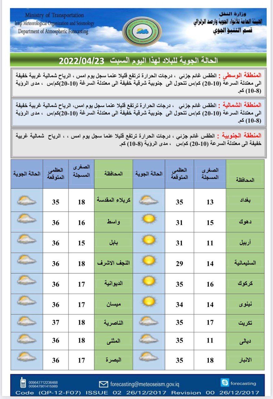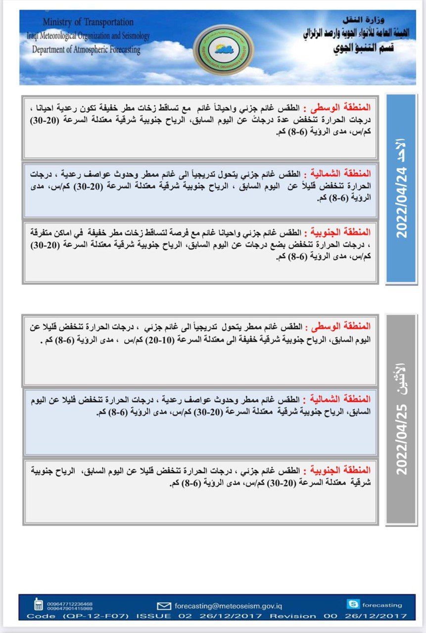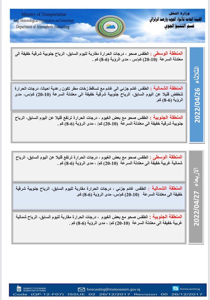 محلياتالانواء الجوية: طقس غائم وتساقط للامطار خلال اليومين المقبلين قبل 4 سنوات 5 مشاهدات شارك الوسومالانواء الجويةطقس غائمقد يهمك أيضا رياضة إعلان حرب.. ريال مدريد يجهز تقريرًا للفيفا حول قضية نيجريرا قبل 24 دقيقة 7 مشاهدات عربي ودولي الأردن.. سيناريو حل البرلمان وتعديل الدستور يعود للواجهة قبل 29 دقيقة 6 مشاهدات عربي ودولي إيران تعلن تفكيك خلية تابعة لجماعة "خلق" في طهران قبل 37 دقيقة 7 مشاهدات عربي ودولي أكسيوس: ترامب يعتزم إعلان بدء المرحلة الثانية من اتفاق غزة قبل عيد الميلاد قبل 47 دقيقة 7 مشاهدات محليات طقس العراق.. أمطار رعدية وانخفاض بدرجات الحرارة خلال الأيام المقبلة قبل ساعتين 9 مشاهدات
