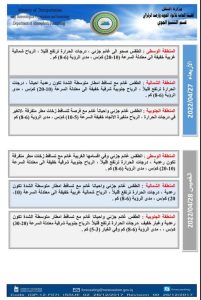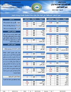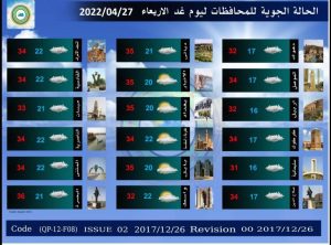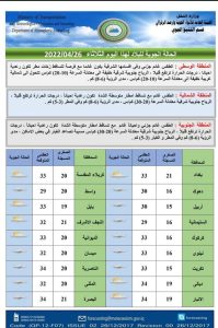أعلنت هيئة الأنواء الجوية، الثلاثاء، حالة الطقس في البلاد للأيام المقبلة، فيما توقعت تساقط أمطار وتصاعد الغبار مع ارتفاع في درجات الحرارة.