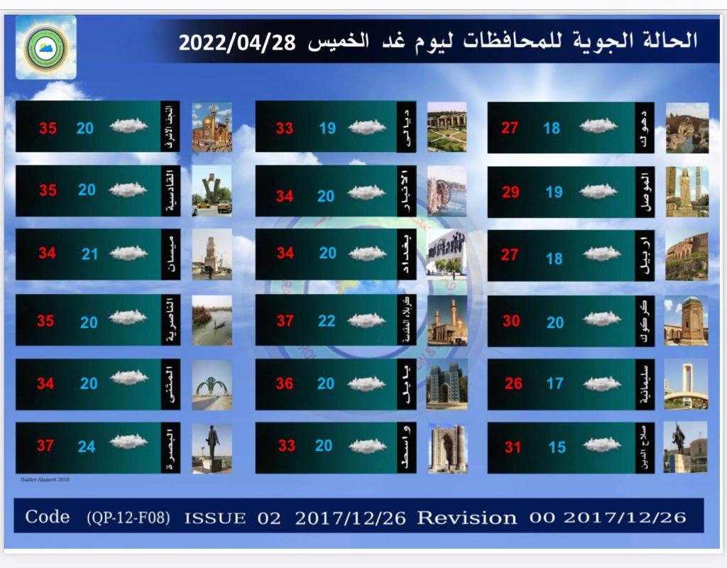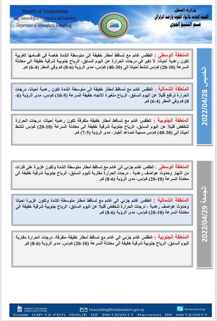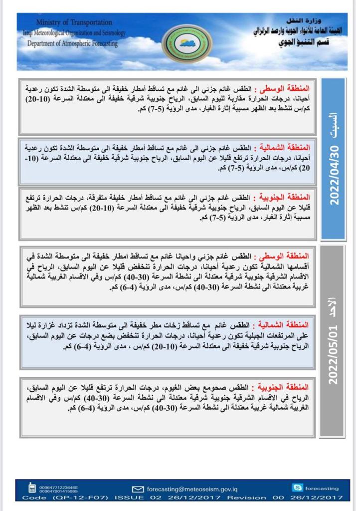 محلياتطقس العراق.. استمرار تساقط الأمطار حتى الأسبوع المقبل قبل 4 سنوات 2 مشاهدات شارك الطقساعلنت هيئة الانواء الجوية، الحالة الجوية للعراق خلال الايام المقبلة، فيما اشارت الى استمرار الامطار حتى الاسبوع المقبل. الوسومطقس العراققد يهمك أيضا محليات العراق يستعد لاستقبال حالة جوية غير مستقرة وأمطار غزيرة اعتباراً من مساء الغد قبل 24 دقيقة 2 مشاهدات عربي ودولي ألمانيا: سيتعين على أوروبا الحوار مع روسيا "في مرحلة ما" قبل 39 دقيقة 4 مشاهدات عربي ودولي الجمعية العامة للأمم المتحدة تعتمد قرارا يجدد ولاية وكالة الأونروا 3 سنوات قبل ساعة واحدة 14 مشاهدات رياضة أحدهم من فنربخشة وآخر من غلطة سراي.. اعتقال 27 لاعبًا بالدوري التركي بقضية "المراهنات" قبل ساعة واحدة 7 مشاهدات عربي ودولي فرنسا.. محاكمة عراقيين وسوداني إثر حادث غرق مركب مهاجرين خلف قتلى في قناة المانش قبل ساعتين 7 مشاهدات