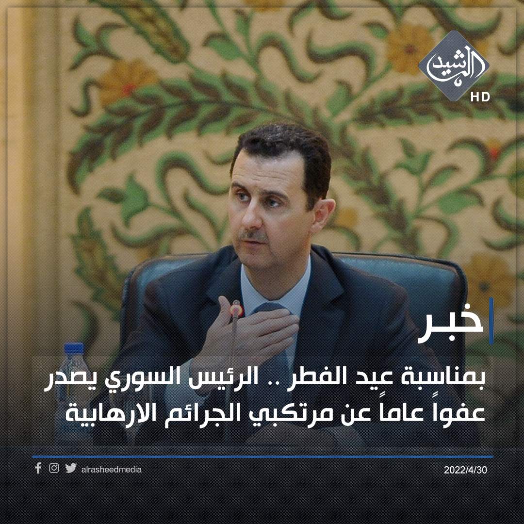 ونشرت الرئاسة السورية بيانا جاء فيه: أصدر الرئيس بشار الأسد المرسوم التشريعي رقم /7/ لعام 2022 الذي يقضي بمنح عفو عام عن الجرائم الإرهابية المرتكبة من السوريين قبل تاريخ 30أبريل 2022 عدا التي أفضت إلى موت إنسان، والمنصوص عليها في قانون مكافحة الإرهاب رقم /19/ لعام 2012 وقانون العقوبات الصادر بالمرسوم التشريعي رقم /148/ لعام 1949 وتعديلاته.