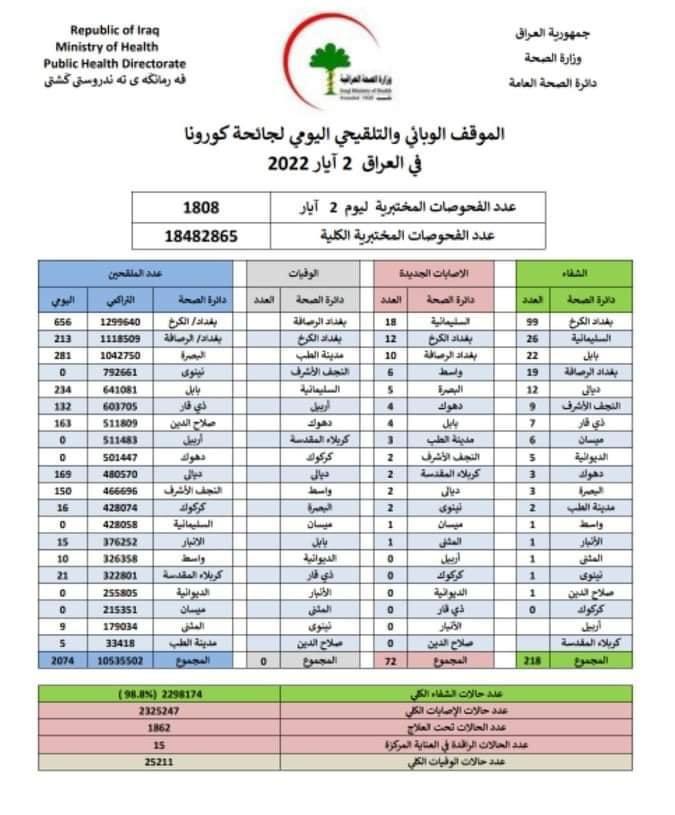 وقالت الوزارة، في بيان تلقته الرشيد، أنه “تم تسجيل ٧٢ إصابة جديدة بفيروس كورونا، و ٢١٨ حالة شفاء من المرض، دون وفيات”.