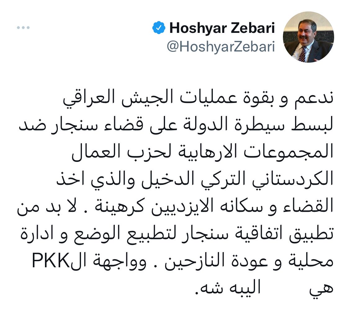 وقال زيباري، في تغريدة له على تويتر تابعتها “الرشيد”، “ندعم وبقوة عمليات الجيش العراقي لبسط سيطرة الدولة على قضاء سنجار ضد المجموعات الارهابية لحزب العمال الكردستاني التركي الدخيل والذي اخذ القضاء و سكانه الايزديين كرهينة”.