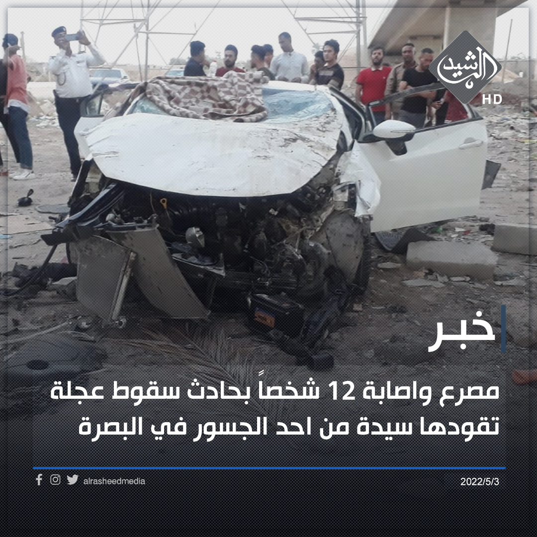 اعلنت مديرية المرور في البصرة، اليوم الثلاثاء، مصرع واصابة 12 شخصاً بحادث سقوط عجلة تقودها سيدة من احد الجسور بالمحافظة.