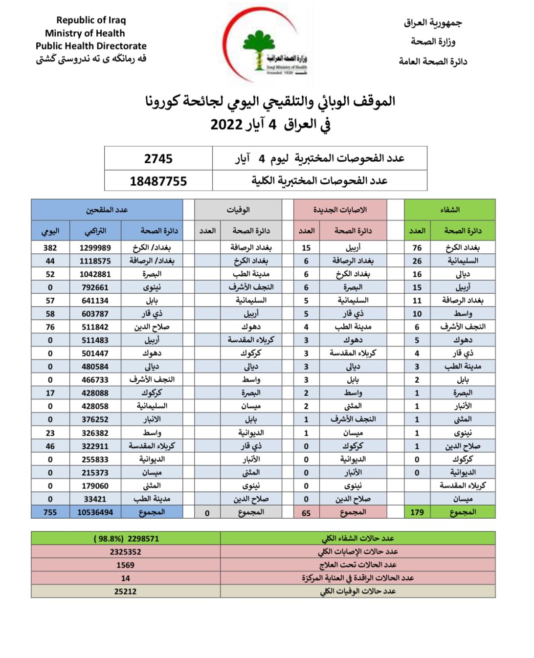 أعلنت وزارة الصحة، اليوم الاربعاء، الموقف الوبائي اليومي لجائحة كورونا في عموم العراق.