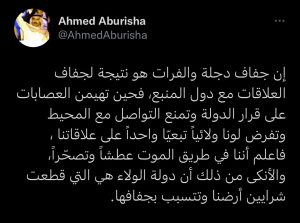 محلياتابو ريشة: جفاف دجلة والفرات هو نتيجة لجفاف العلاقات مع دول المنبع قبل 4 سنوات 7 مشاهدات شارك الوسوماحمد ابو ريشةقد يهمك أيضا سياسة البطريركية الكلدانية توضح بشأن ما تداولته بعض المواقع والصفحات من تصريحات لويس ساكو قبل 3 ساعات 15 مشاهدات عربي ودولي الداخلية السورية: اعتقال زعيم تنظيم داعش بدمشق في عملية أمنية بالتعاون مع التحالف الدولي قبل 4 ساعات 12 مشاهدات سياسة السيد الصدر: لا مكان للتطبيع ولا لشرعنته في العراق قبل 4 ساعات 10 مشاهدات عربي ودولي الحرس الثوري الإيراني يوقف سفينة محملة بـ4 ملايين لتر من الوقود المهرب في مياه الخليج قبل 5 ساعات 11 مشاهدات عربي ودولي الجيش الأردني يشن غارات استهدفت شبكات تهريب ومزارع مخدرات بريف السويداء قبل 5 ساعات 10 مشاهدات