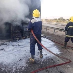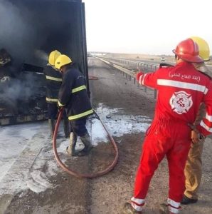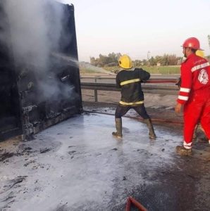 وذكرت المديرية في بيان تلقته الرشيد، ان”مفارزنا في مراكز ( الديوانية سومر الدغارة ) اخمدت حادث حادث حريق اندلع بصهريج محمل بمادة البنزين نتيجة اصطدامه بعجلة تريلة تحمل حاوية أجهزة تبريد على الطريق الدولي السريع بغداد بصرة ضمن حدود قضاء سومر”.