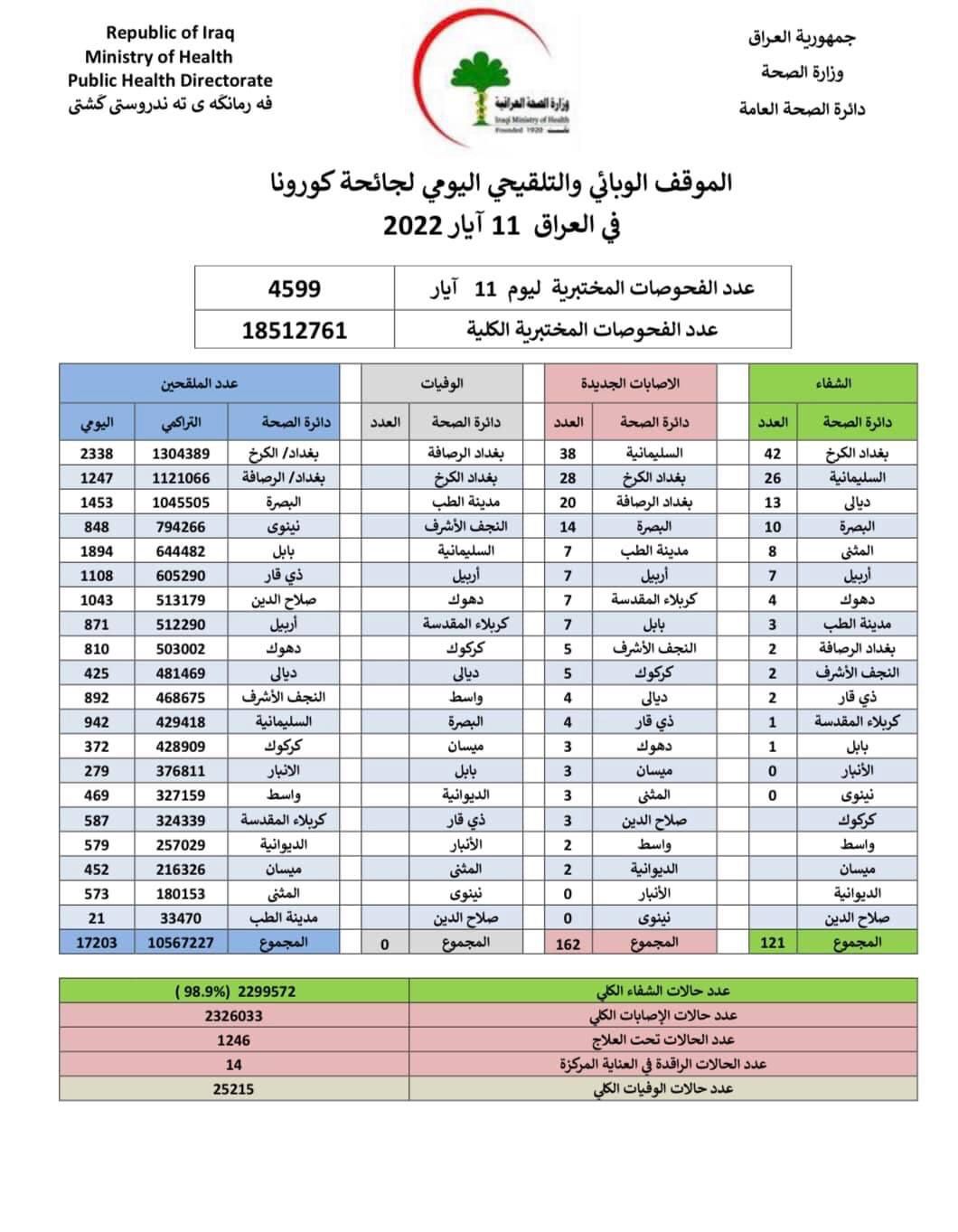 أعلنت وزارة الصحة، اليوم الاربعاء، الموقف الوبائي اليومي لجائحة كورونا في عموم العراق.