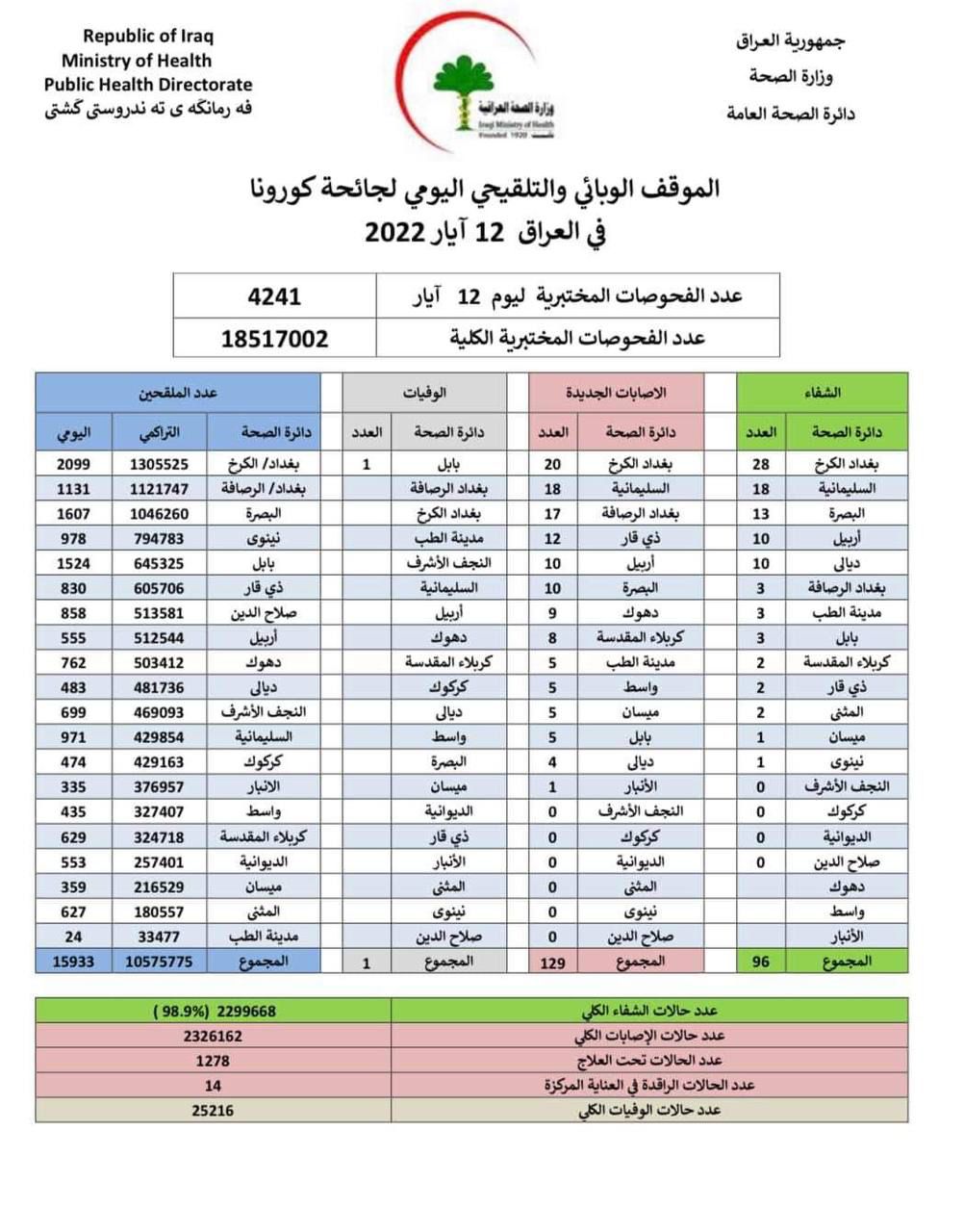 وقالت الوزارة، في بيان تلقته الرشيد، أنه “تم تسجيل 129 إصابة جديدة بفيروس كورونا، و 96 حالة شفاء من المرض”.