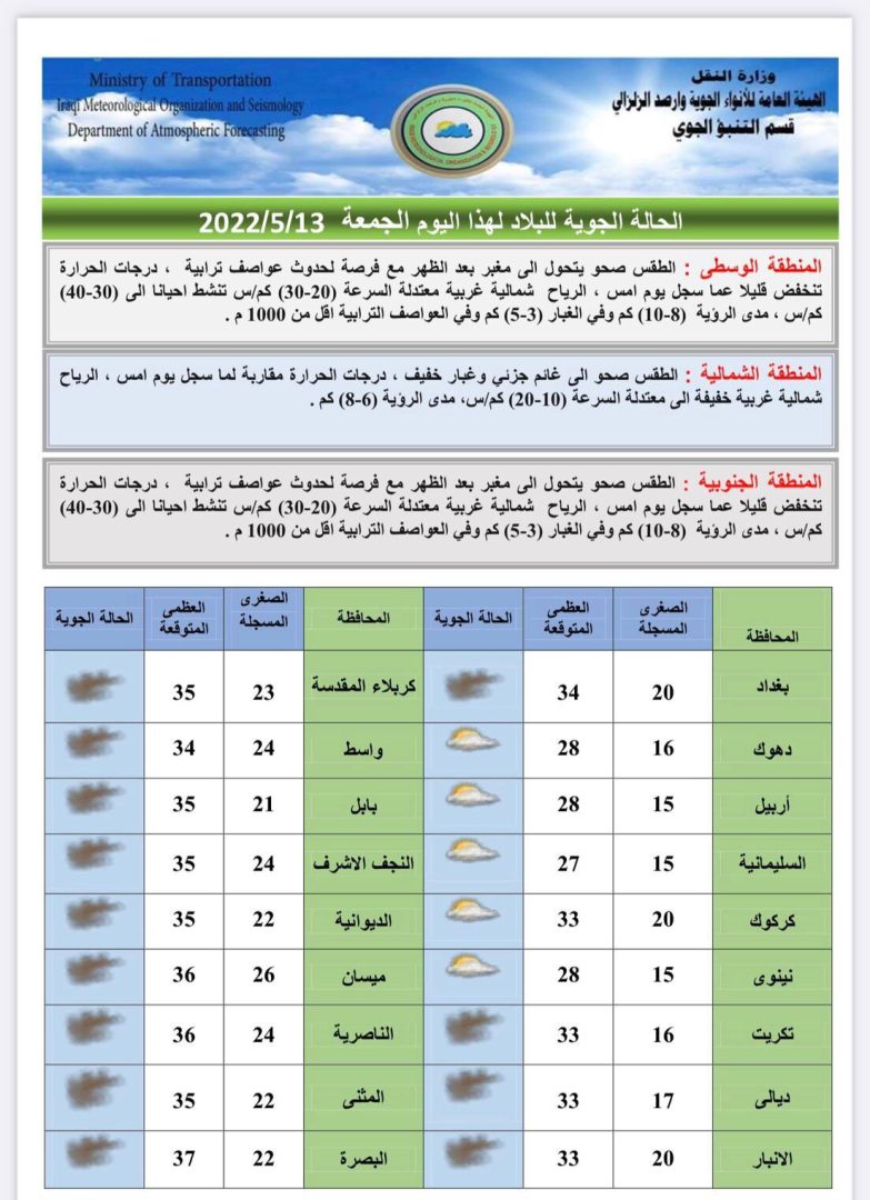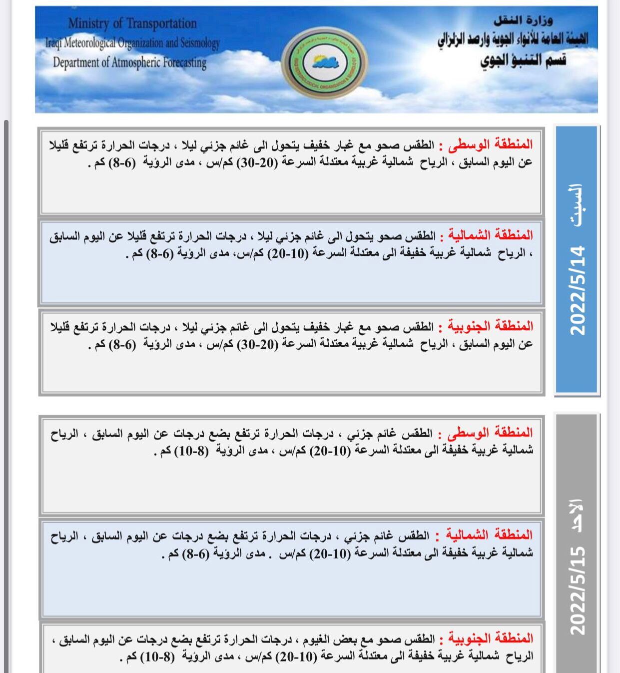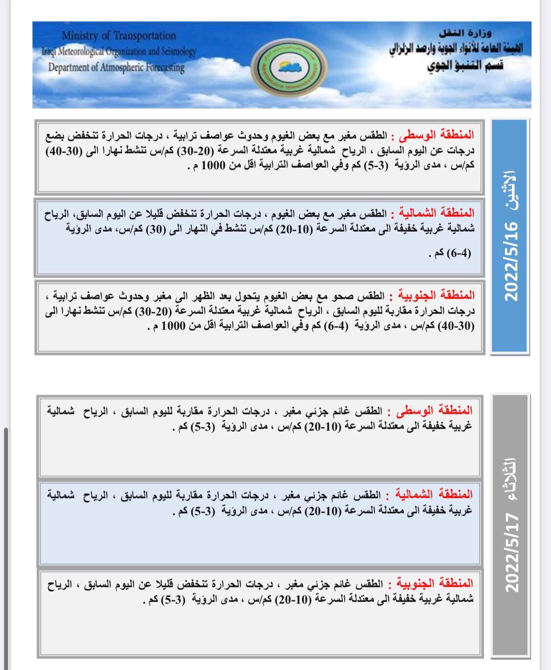 محلياتالانواء الجوية: عواصف ترابية وانخفاض الحرارة الاثنين المقبل قبل 4 سنوات 10 مشاهدات شارك الوسومالانواء الجويةالطقسقد يهمك أيضا رياضة إعلان حرب.. ريال مدريد يجهز تقريرًا للفيفا حول قضية نيجريرا قبل 24 دقيقة 7 مشاهدات عربي ودولي الأردن.. سيناريو حل البرلمان وتعديل الدستور يعود للواجهة قبل 29 دقيقة 6 مشاهدات عربي ودولي إيران تعلن تفكيك خلية تابعة لجماعة "خلق" في طهران قبل 38 دقيقة 7 مشاهدات عربي ودولي أكسيوس: ترامب يعتزم إعلان بدء المرحلة الثانية من اتفاق غزة قبل عيد الميلاد قبل 47 دقيقة 7 مشاهدات محليات طقس العراق.. أمطار رعدية وانخفاض بدرجات الحرارة خلال الأيام المقبلة قبل ساعتين 9 مشاهدات